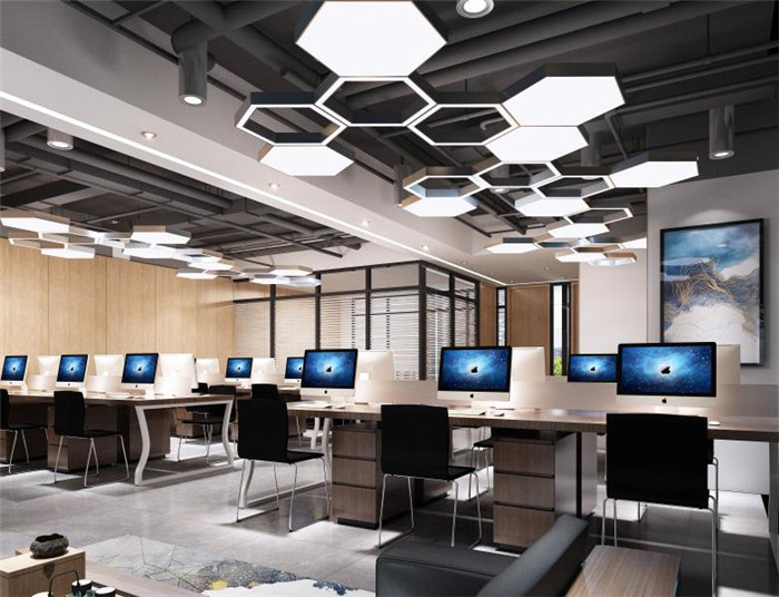 3、整體空間以現(xiàn)代科技感為主,運用線條燈來營造空間的整體氛圍,提升科技感的體驗,在局部用活躍的顏色來跳動整個空間的色彩,形成不一樣的風格。會議室設計裝修使用簡潔明了的軟膜天花,給予整個空間的光線之外,形成了自己獨特的裝飾作用。員工辦公室設計用六邊形的蜂巢燈具來打亂整個空間的死板性,讓整個空間更具有創(chuàng)新力。